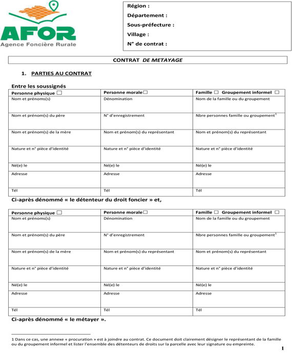 Le Contrat est signé entre le propriétaire de la terre (détenteur du droit foncier) et un exploitant non-propriétaire (locataire de la terre), qui se mettent d’accord sur les termes (la superficie, les conditions, la durée), sur la base du certificat foncier.
